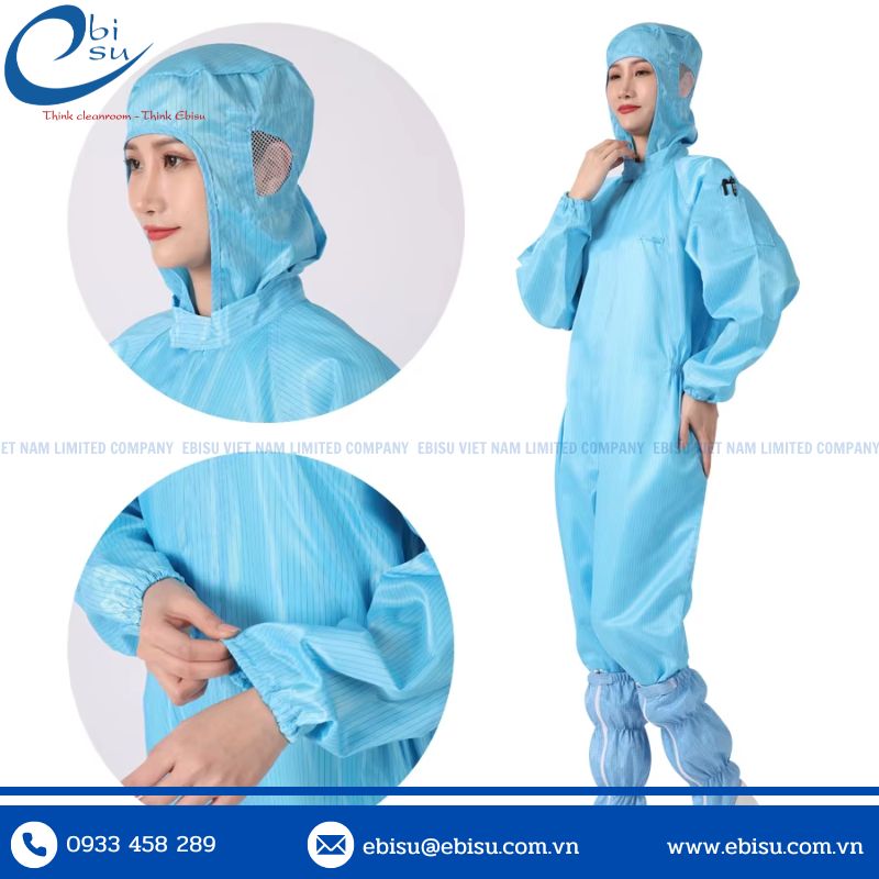 Điểm nổi bật của Ebisu là hệ thống xưởng may hiện đại, được đầu tư bài bản về máy móc, dây chuyền kiểm định và khu kiểm tra điện trở vải trước khi giao hàng. Các mẫu áo liền quần, áo rời, mũ trùm đầu, bao giày, khẩu trang ESD đều được thiết kế tối ưu, đảm bảo vừa vặn, thông thoáng, đồng thời vẫn duy trì khả năng chống tĩnh điện ổn định.