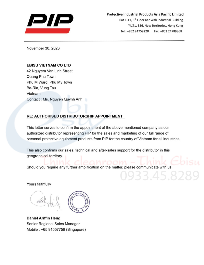 Ebisu Việt Nam tự hào là nhà phân phối chính thức của PIP, đại diện cho PIP để bán và tiếp thị toàn bộ các sản phẩm thiết bị bảo hộ cá nhân của PIP cho đất nước Việt Nam cho tất cả các ngành công nghiệp. Đến với Ebisu Việt Nam, bạn sẽ tìm thấy được những giải pháp hoàn hảo trong ngành PPE.