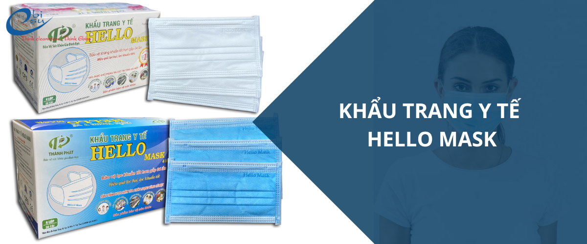 Khẩu trang y tế Hello Mask là sản phẩm bảo hộ y tế được sản xuất với tiêu chuẩn chất lượng nghiêm ngặt, đảm bảo khả năng lọc vi khuẩn, bụi mịn và ngăn chặn các tác nhân có hại trong không khí. Khẩu trang thường có thiết kế 3 lớp, được sản xuất từ vải không dệt, không gây kích ứng da, phù hợp với mọi lứa tuổi và đối tượng sử dụng.