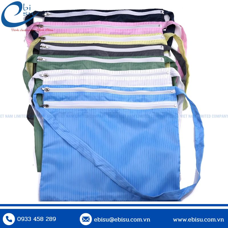 Túi đeo chéo vải phòng sạch là loại túi được thiết kế chuyên biệt để sử dụng trong môi trường sản xuất yêu cầu kiểm soát bụi bẩn và tĩnh điện. Túi thường được làm từ các loại vải ESD (Electrostatic Discharge) như polyester pha sợi carbon, có khả năng chống tĩnh điện, giúp hạn chế tối đa sự phát sinh và tích tụ điện tích trên bề mặt túi.