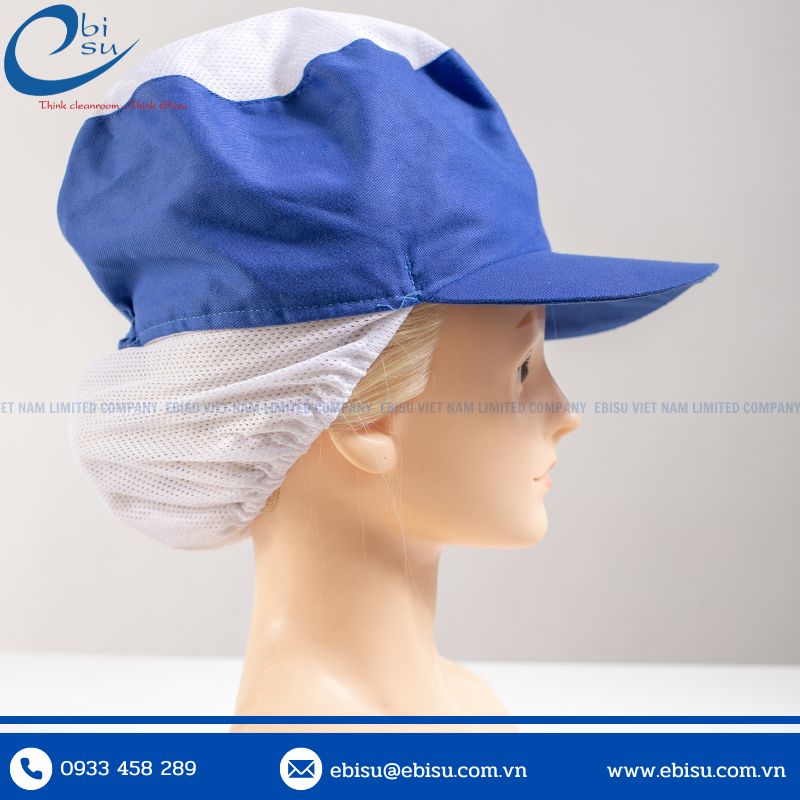 Nón lưỡi trai phòng sạch bọc tóc nữ được sản xuất từ vải phòng sạch có pha sợi carbon dẫn điện, giúp hạn chế tình trạng tĩnh điện và bảo vệ sức khỏe người lao động.